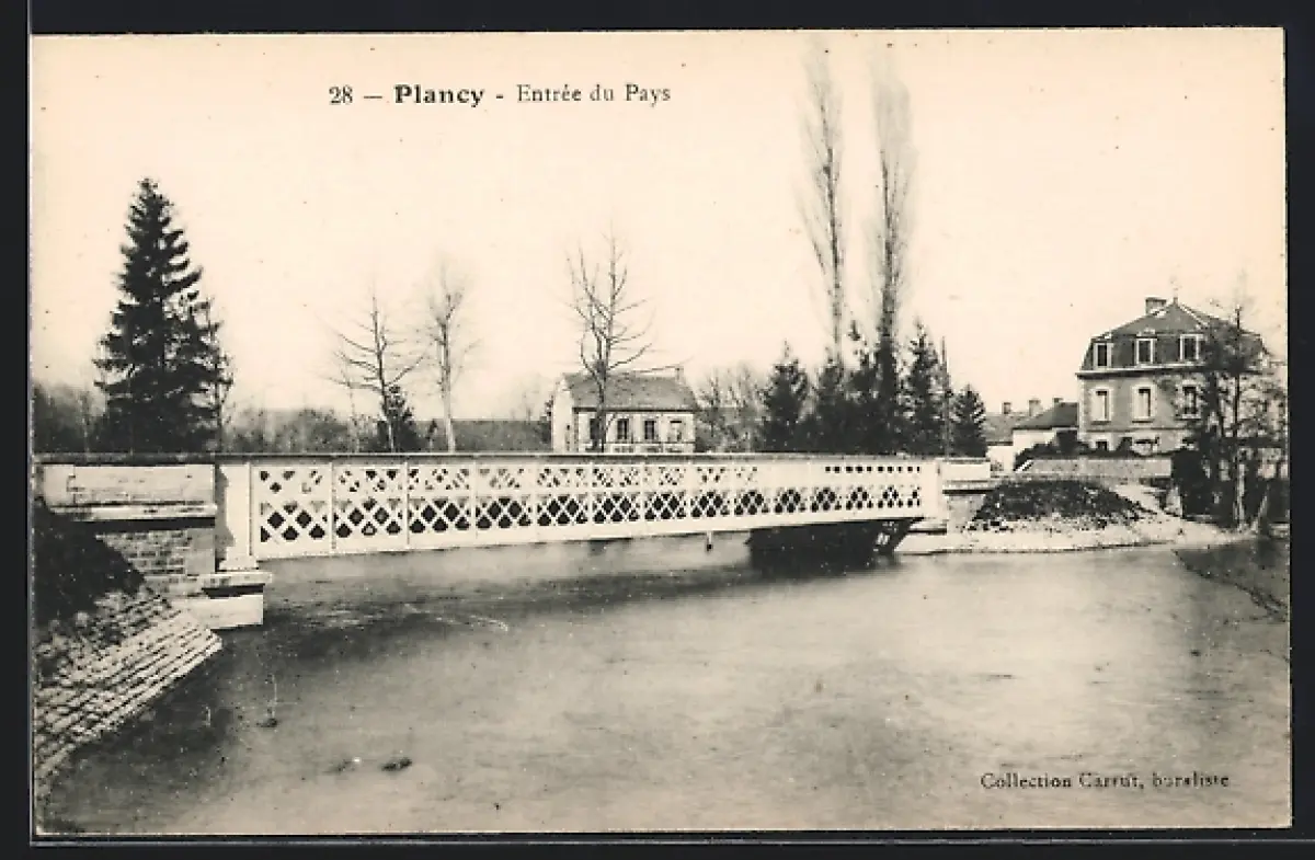 AK Plancy, Entrée du Pays avec pont et maisons environnantes
