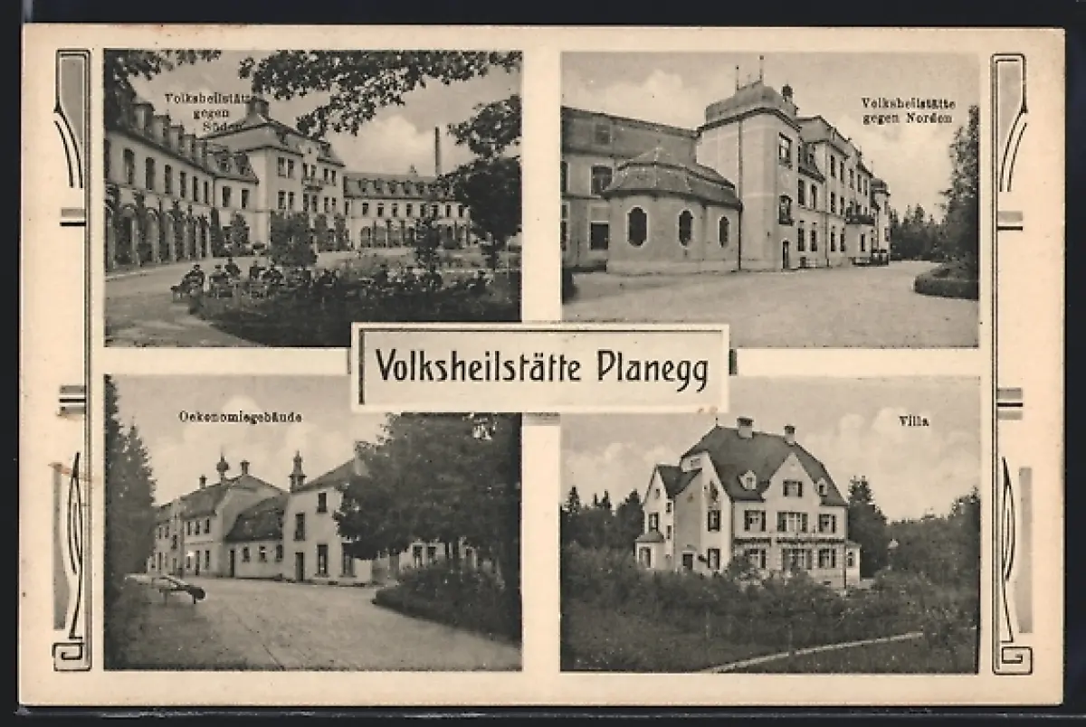 AK Planegg, Volksheilstätte mit Nord und Süd-Partie, Villa und Ökonomiegebäude, Jugendstilrahmen