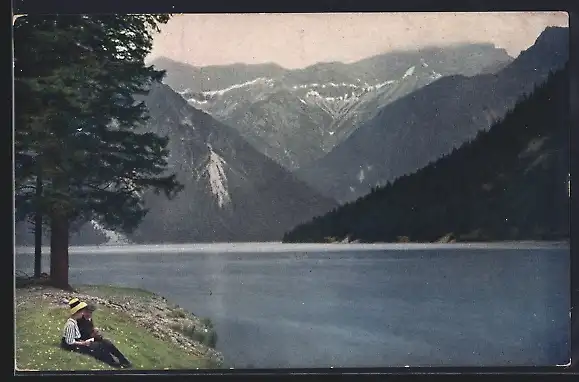 AK Plansee, Auf der Wiese am Ufer des Sees sitzendes Paar
