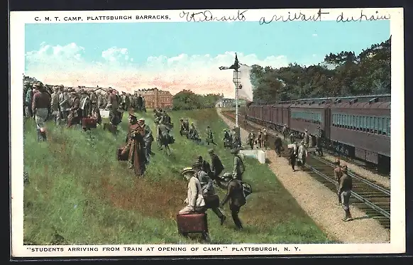 AK Plattsburgh, NY, C. M. T. Camp, Plattsburgh Barracks, Students arriving from train