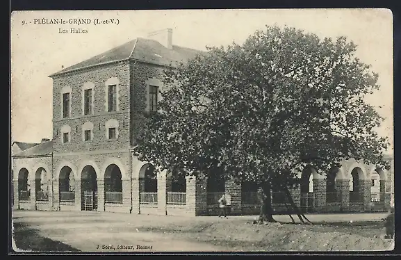 AK Plelán-le-Grand, Les Halles, bâtiment en brique avec arbres devant