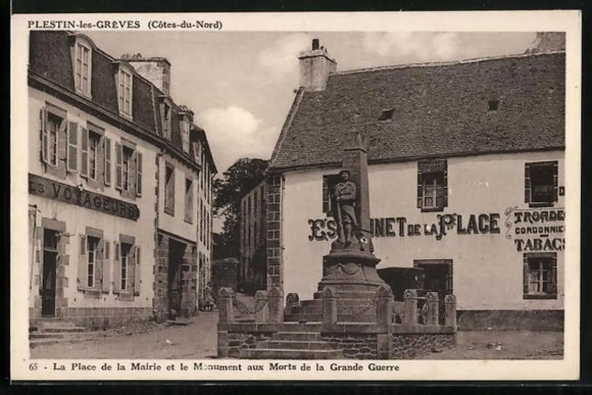 AK Plestin-les-Grèves /Côtes-du-Nord, La Place de la Mairie et le Monument aux Morts de la Grande Guerre