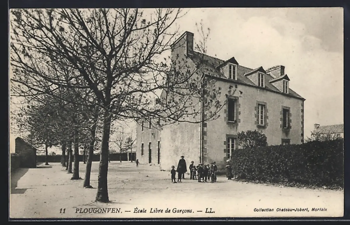 AK Plougonven, École Libre de Garcons et enfants jouant dans la cour