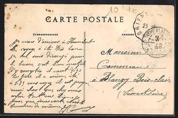 Personenbezogene Daten auf der Rückseite der Karte wurden durch blauen Textmarker unkenntlich gemacht. Die blauen Stellen sind auf die Vorderseite durchgeweicht und wirken sich negativ auf das Postkartenfoto aus