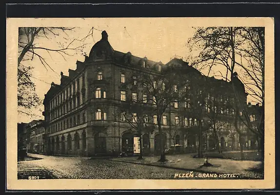 AK Plzen, Grand Hotel mit Litfasssäule