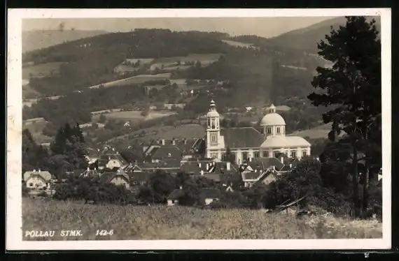 AK Pöllau, Blick von der Bergwiese auf Ort mit Kirche