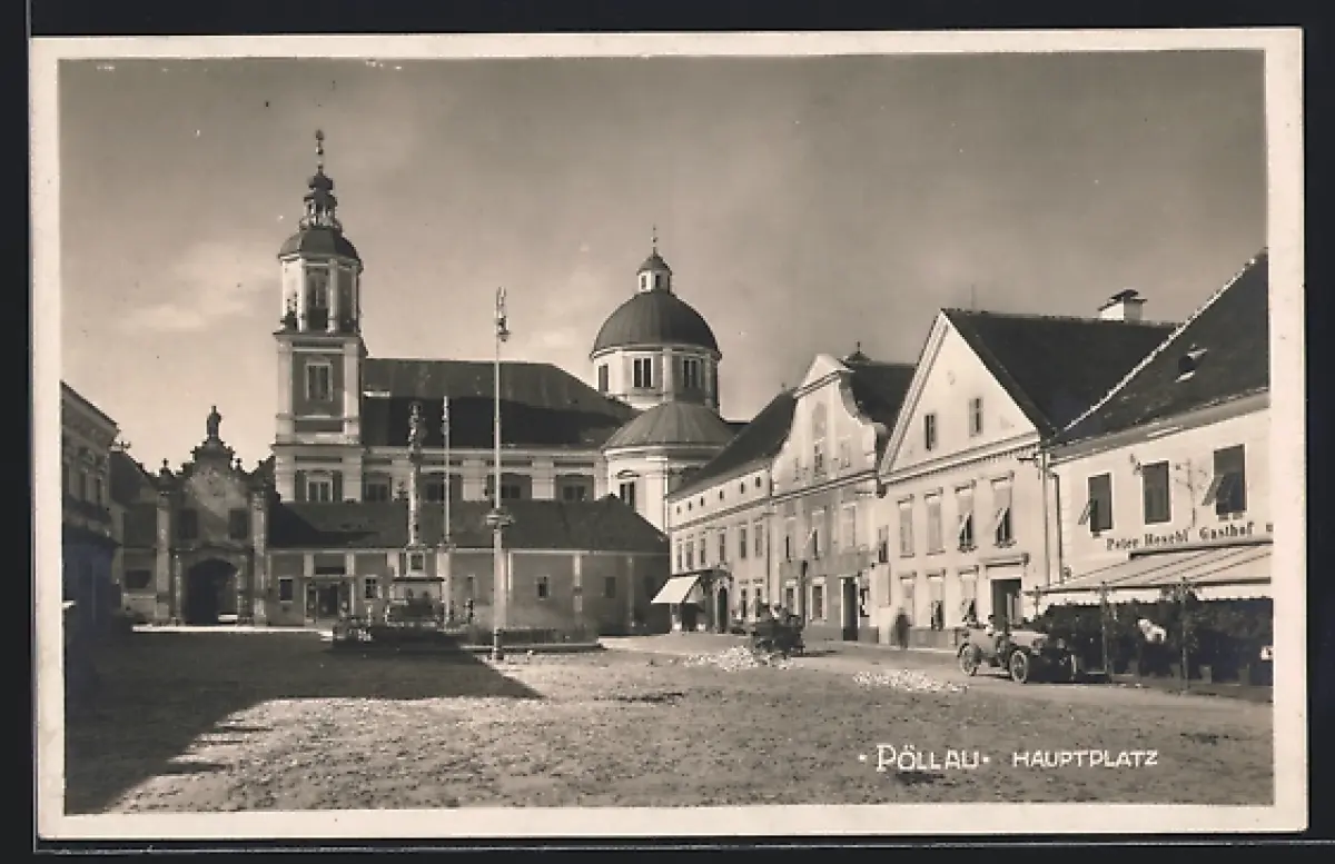 AK Pöllau, Platzansicht mit Kirche, Gasthof Peter Heschl