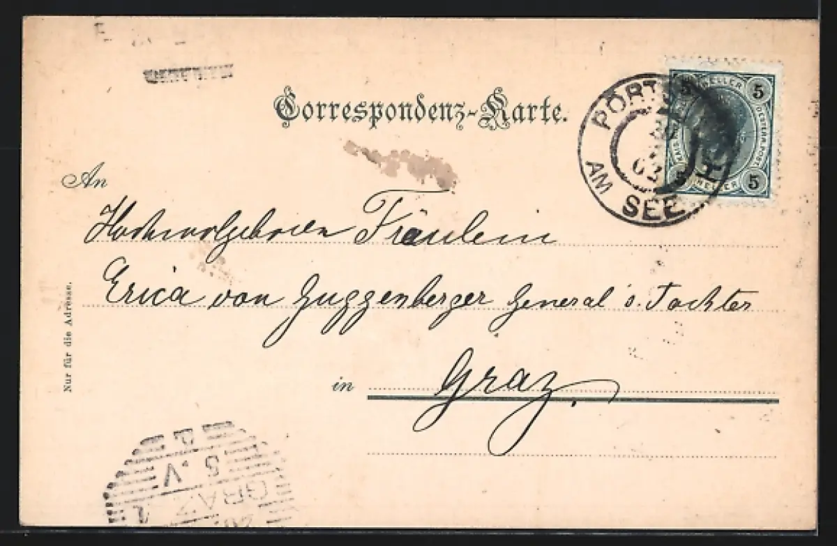 Personenbezogene Daten auf der Rückseite der Karte wurden durch blauen Textmarker unkenntlich gemacht. Die blauen Stellen sind auf die Vorderseite durchgeweicht und wirken sich negativ auf das Postkartenfoto aus