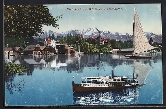 AK Pörtschach am Wörthersee, Seedampfer vor der Ortschaft