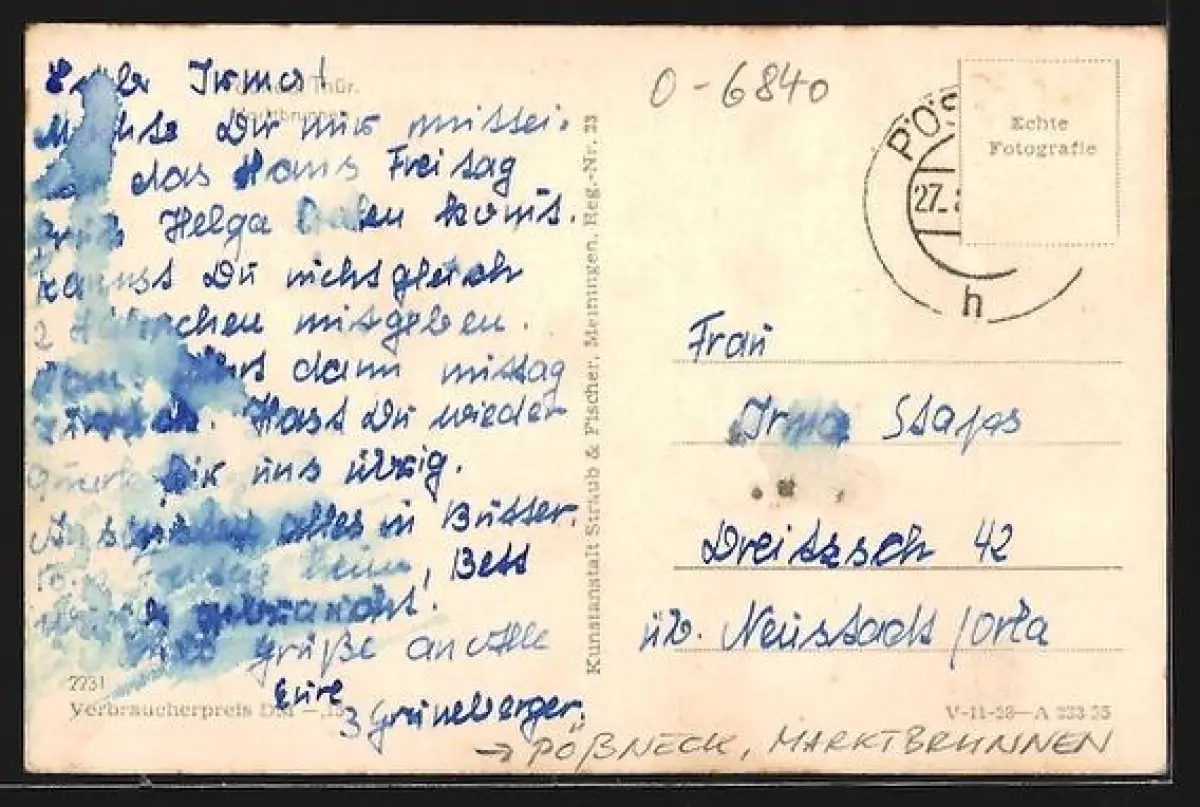 Personenbezogene Daten auf der Rückseite der Karte wurden durch blauen Textmarker unkenntlich gemacht. Die blauen Stellen sind auf die Vorderseite durchgeweicht und wirken sich negativ auf das Postkartenfoto aus