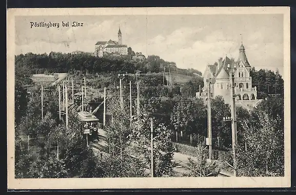 AK Pöstlingberg bei Linz, Ortsansicht mit Bergbahn aus der Vogelschau