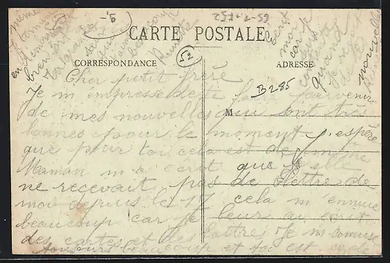 Personenbezogene Daten auf der Rückseite der Karte wurden durch blauen Textmarker unkenntlich gemacht. Die blauen Stellen sind auf die Vorderseite durchgeweicht und wirken sich negativ auf das Postkartenfoto aus
