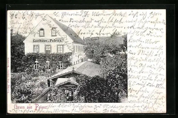 AK Polenz, Gasthaus, vom Garten gesehen, mit Nebengebäude