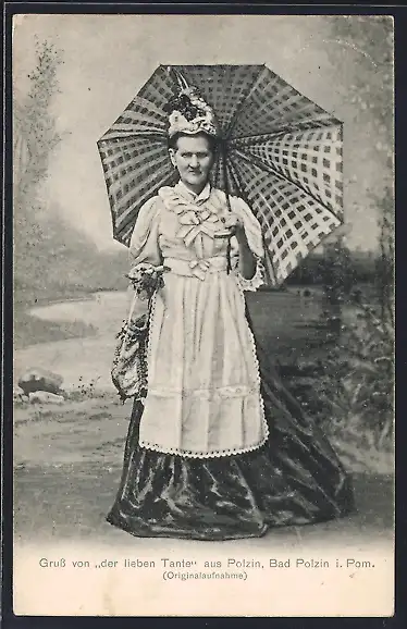 AK Polzin, Die liebe Tante im Kleid mit Regenschirm
