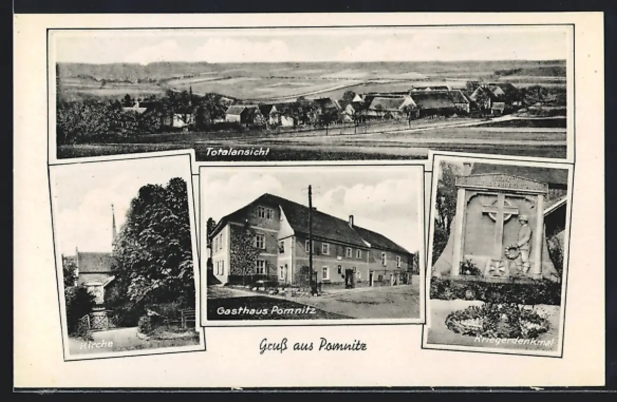 AK Pomnitz, Kriegerdenkmal, Kirche, Gasthaus Pomnitz