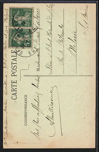 Personenbezogene Daten auf der Rückseite der Karte wurden durch blauen Textmarker unkenntlich gemacht. Die blauen Stellen sind auf die Vorderseite durchgeweicht und wirken sich negativ auf das Postkartenfoto aus