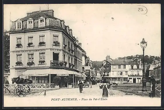 AK Pont-Audemer, Place du Pot-d’Étain avec calèche et passants