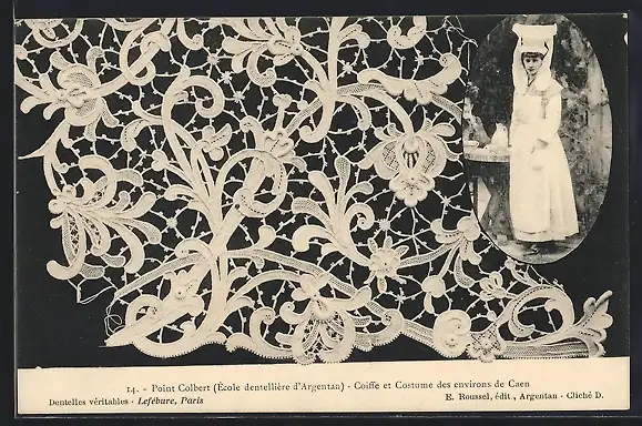 AK Pont Colbert, Coiffe et Costume des environs de Caen, Frau in Tracht, Klöppelspitze
