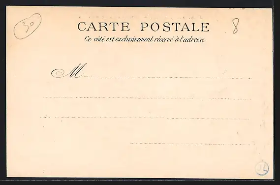 Personenbezogene Daten auf der Rückseite der Karte wurden durch blauen Textmarker unkenntlich gemacht. Die blauen Stellen sind auf die Vorderseite durchgeweicht und wirken sich negativ auf das Postkartenfoto aus