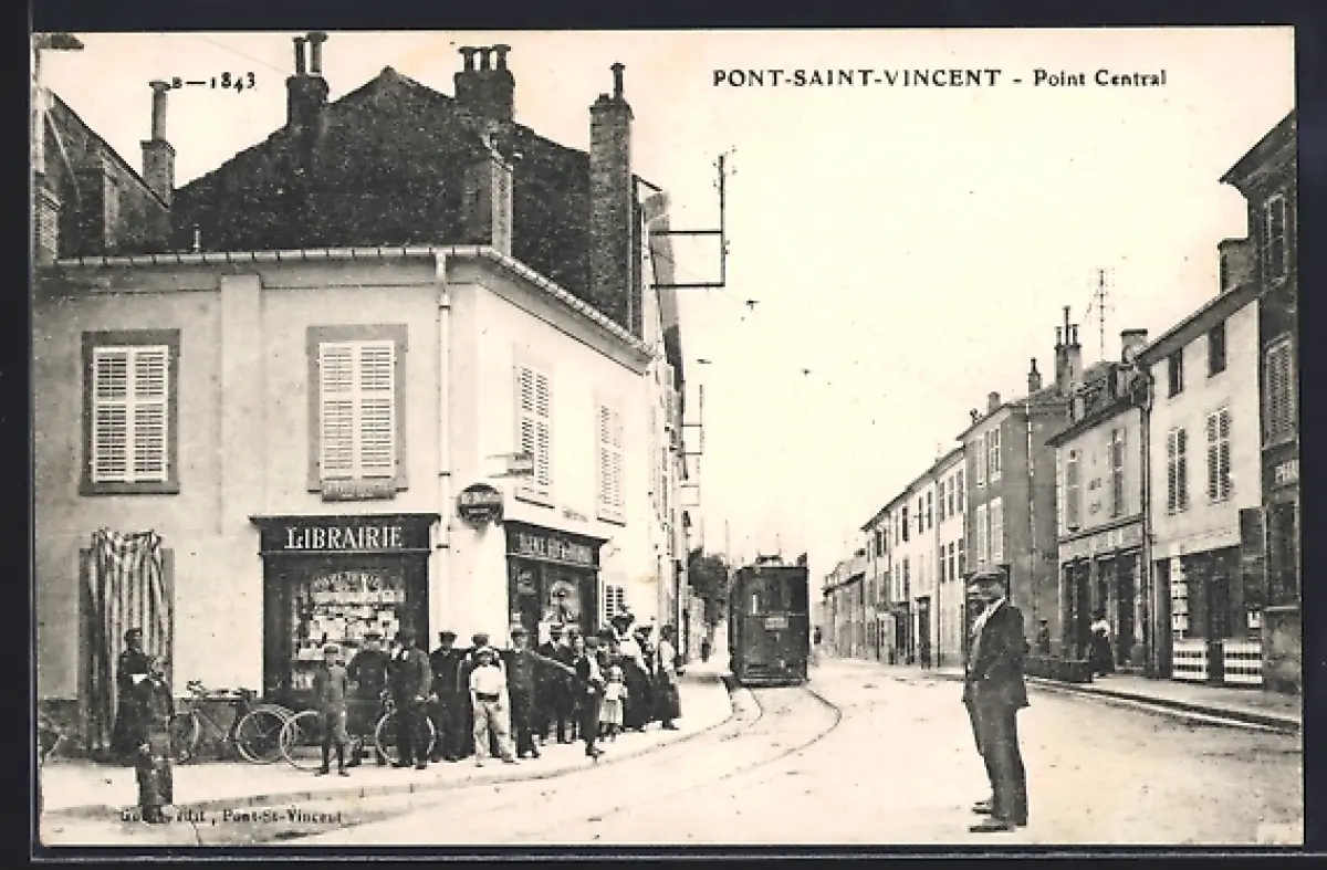 AK Pont-Saint-Vincent, Point Central avec librairie et tramway