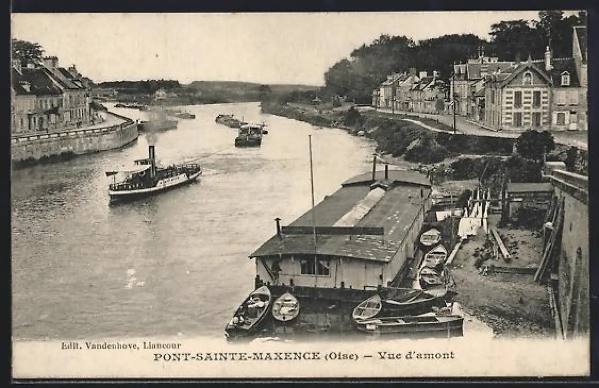 AK Pont-Sainte-Maxence /Oise, Vue d`amont avec bateaux sur la rivière et maisons en bordure