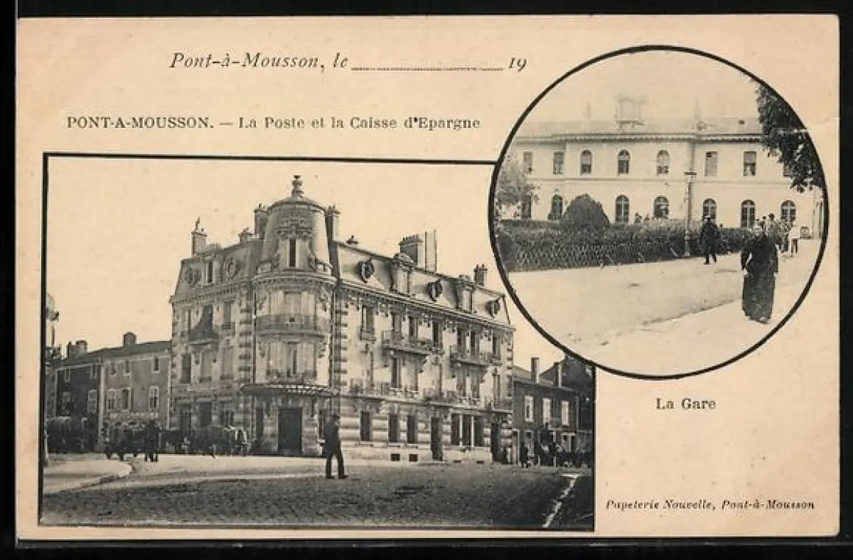 AK Pont-a-Mousson, La Gare, La Poste et la Caisse d`Espagne, Bahnhof