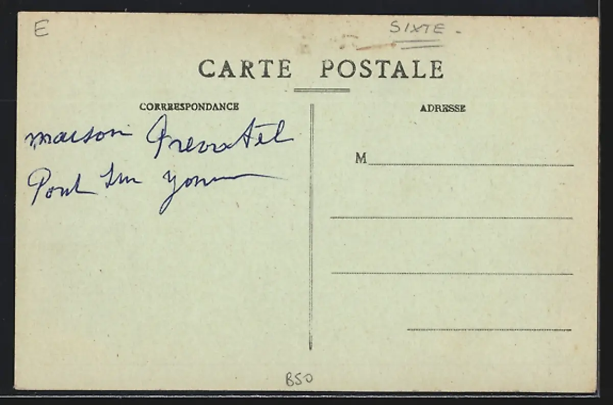 Personenbezogene Daten auf der Rückseite der Karte wurden durch blauen Textmarker unkenntlich gemacht. Die blauen Stellen sind auf die Vorderseite durchgeweicht und wirken sich negativ auf das Postkartenfoto aus