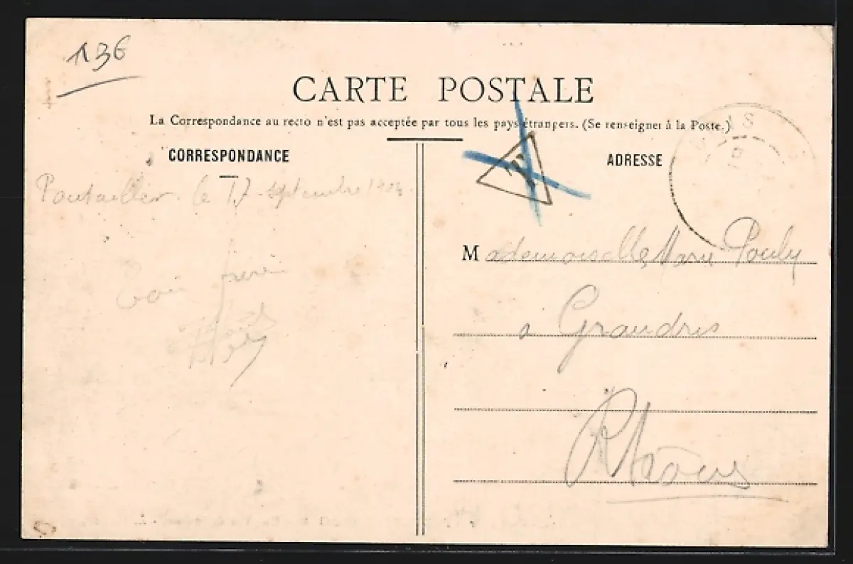 Personenbezogene Daten auf der Rückseite der Karte wurden durch blauen Textmarker unkenntlich gemacht. Die blauen Stellen sind auf die Vorderseite durchgeweicht und wirken sich negativ auf das Postkartenfoto aus