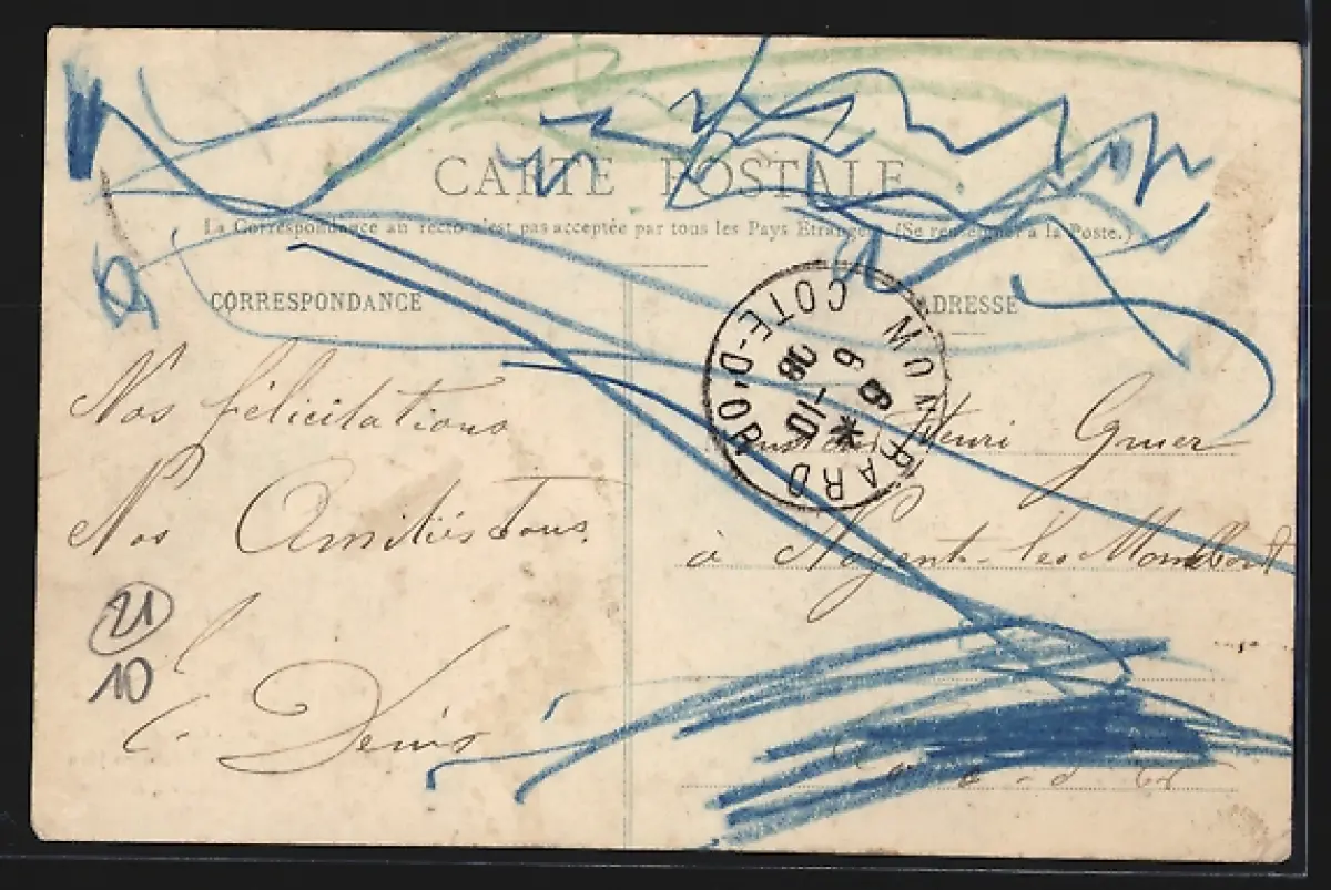 Personenbezogene Daten auf der Rückseite der Karte wurden durch blauen Textmarker unkenntlich gemacht. Die blauen Stellen sind auf die Vorderseite durchgeweicht und wirken sich negativ auf das Postkartenfoto aus