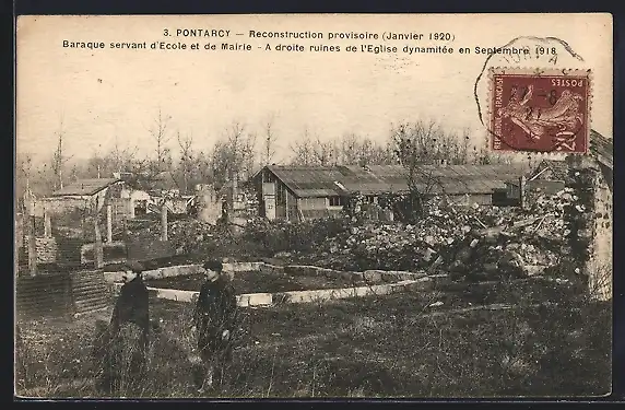 AK Pontarcy, Reconstruction provisoire, Baraque servant d`Ecole et de Mairie, Ruines de l`Eglise