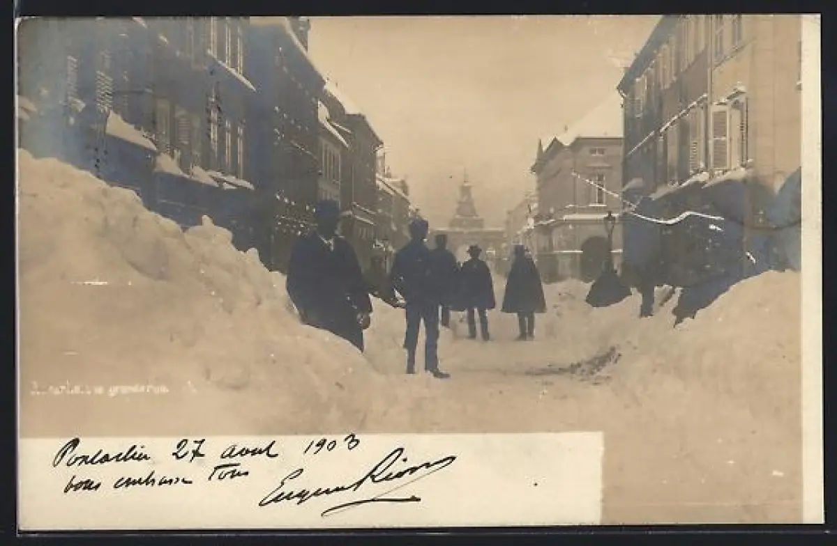 AK Pontarlier, Scène hivernale animée dans une rue enneigée