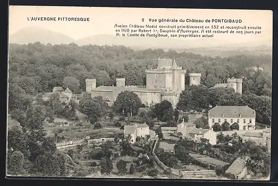AK Pontgibaud, Vue générale du Château médiéval entouré de forêts