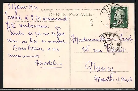Personenbezogene Daten auf der Rückseite der Karte wurden durch blauen Textmarker unkenntlich gemacht. Die blauen Stellen sind auf die Vorderseite durchgeweicht und wirken sich negativ auf das Postkartenfoto aus