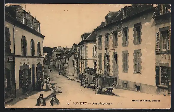 AK Pontivy, Rue Malguenac avec chariot et passants