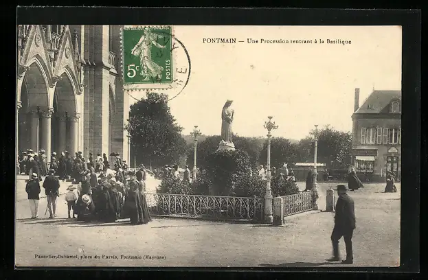 AK Pontmain, Une Procession rentrant à la Basilique