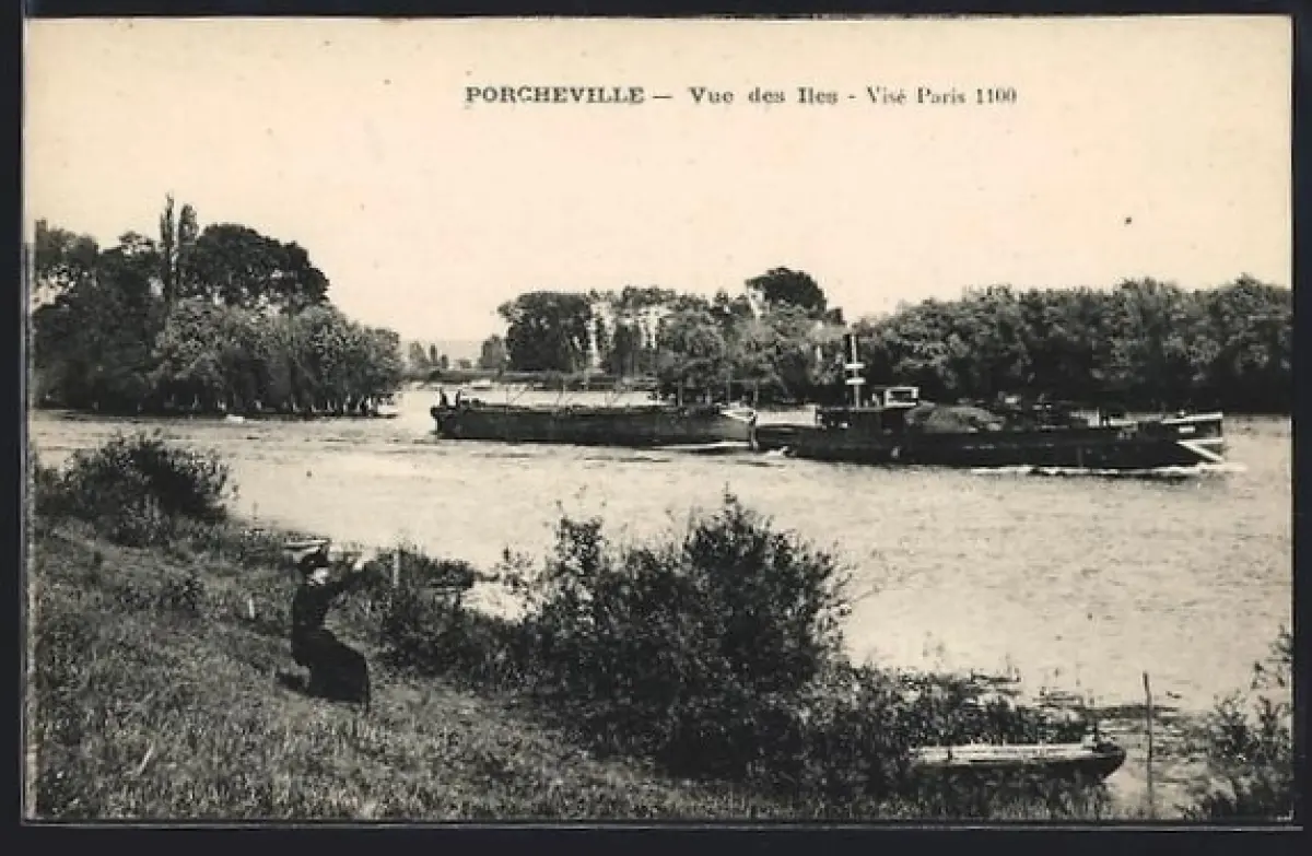 AK Porcheville, Vue des Îles avec péniche sur le fleuve