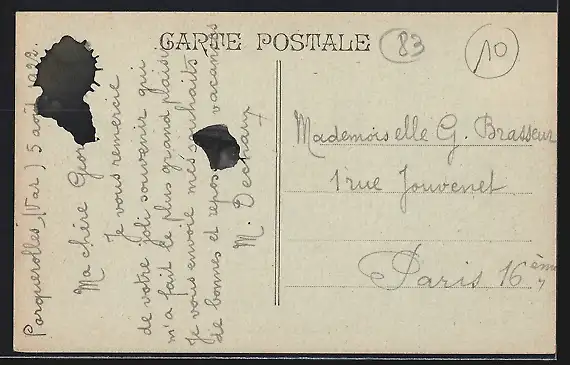 Personenbezogene Daten auf der Rückseite der Karte wurden durch blauen Textmarker unkenntlich gemacht. Die blauen Stellen sind auf die Vorderseite durchgeweicht und wirken sich negativ auf das Postkartenfoto aus