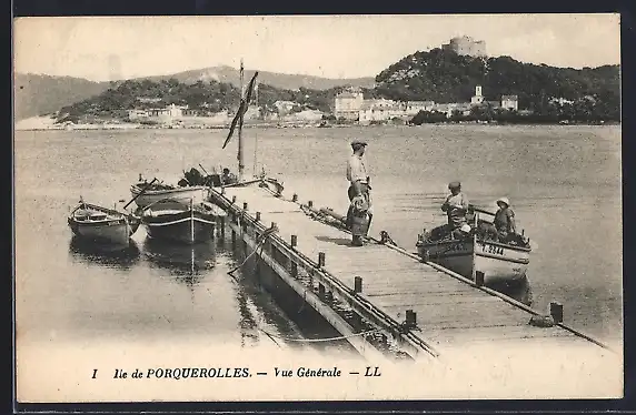 AK Porquerolles, Vue Générale avec jetée et bateaux amarrés