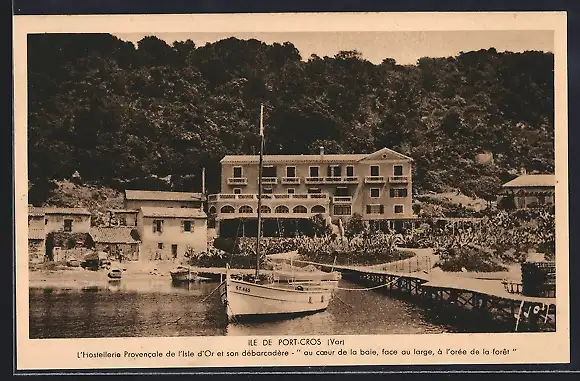 AK Port-Cros, L`Hostellerie Provencale de l`Isle d`Or et son débarcadère dans la baie