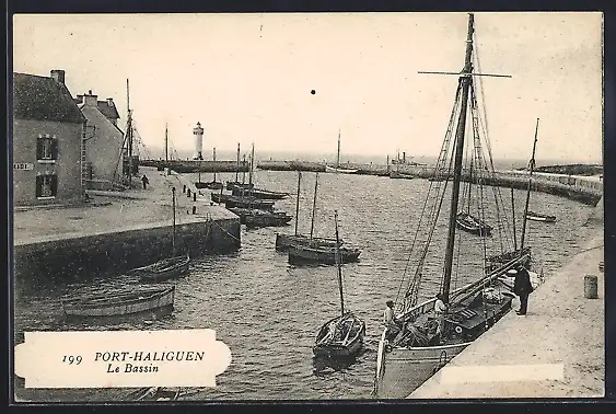 AK Port-Haliguen, Le Bassin avec voiliers et phare en arrière-plan