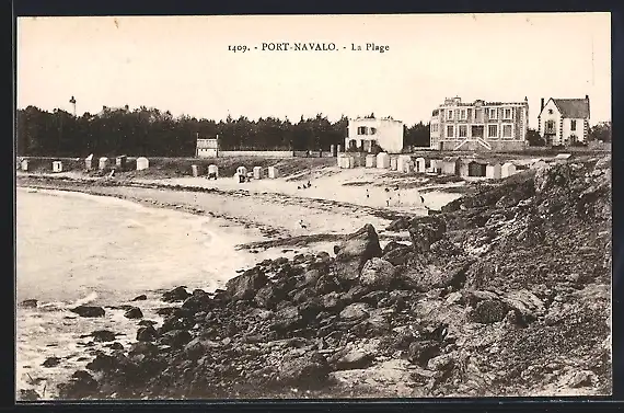 AK Port-Navalo, La Plage et les cabines de bain sur le rivage rocheux