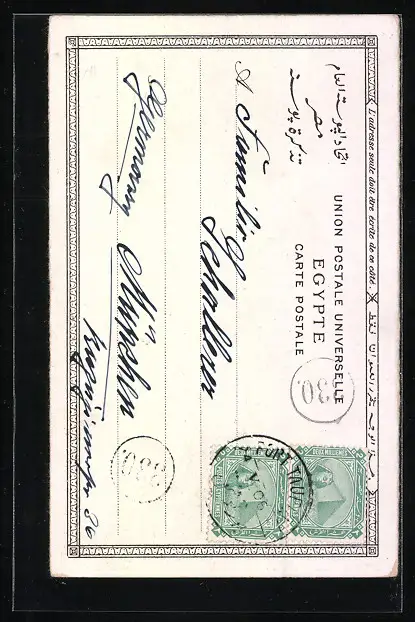 Personenbezogene Daten auf der Rückseite der Karte wurden durch blauen Textmarker unkenntlich gemacht. Die blauen Stellen sind auf die Vorderseite durchgeweicht und wirken sich negativ auf das Postkartenfoto aus