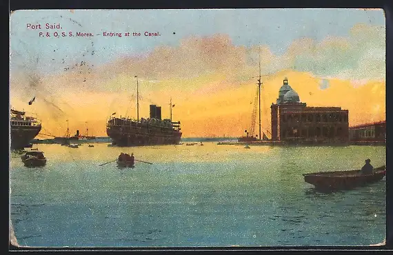 AK Port Said, Passagierschiff P. & O. S. S. Morea, Entring at the Canal, Ruderboote