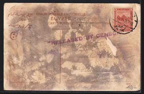 Personenbezogene Daten auf der Rückseite der Karte wurden durch blauen Textmarker unkenntlich gemacht. Die blauen Stellen sind auf die Vorderseite durchgeweicht und wirken sich negativ auf das Postkartenfoto aus