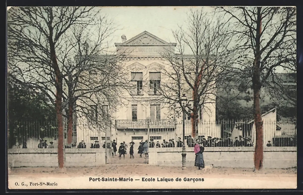 AK Port-Sainte-Marie, École Laïque de Garcons et élèves devant l`entrée