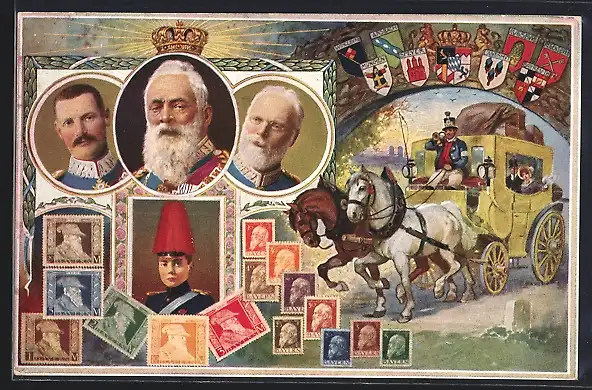 AK Porträt Prinzregent Luitpolds, Postkutsche, Wappen verschiedener Städte und Briefmarken