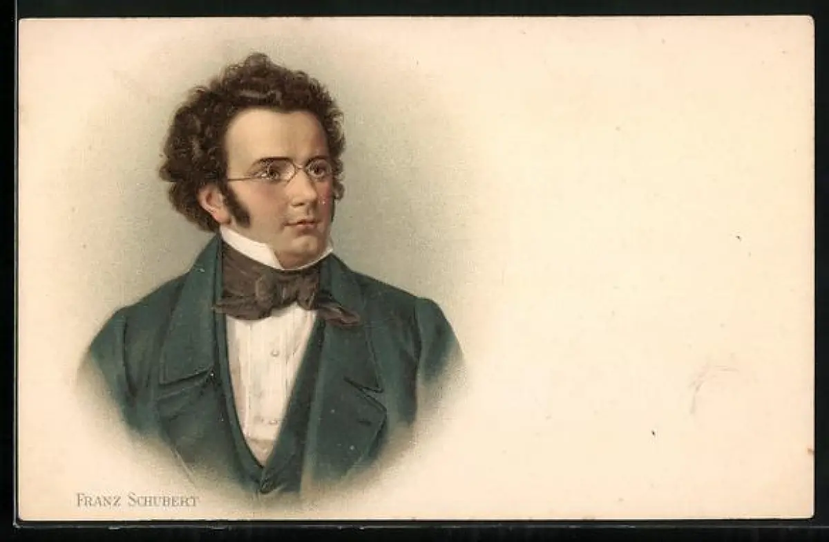 AK Portrait Franz Schubert, Notentext: Etwas geschwind, zart.