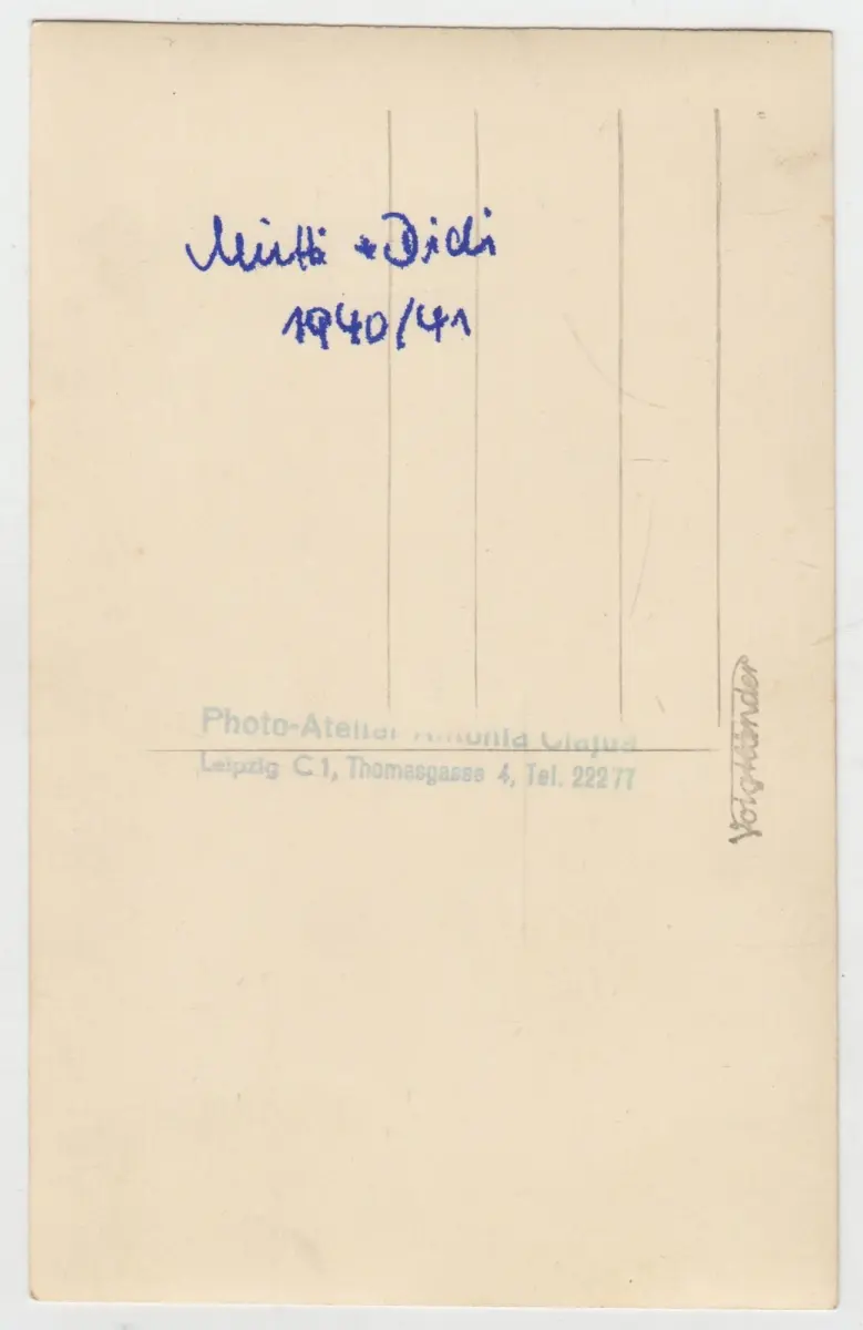 Bemerkungen: Postkarte ohne Briefmarke und ohne Poststempel (ungelaufen) mit üblichen Gebrauchsspuren, Vorderseite leicht tintenfleckig, und handschriftlicher Notiz auf der Rückseite: "Mutti + Didi 1940/41". Bitte beachten Sie auch unsere Abbildungen. Fotokarte.