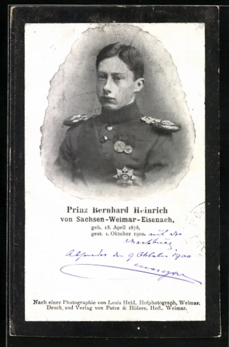 AK Portrait Prinz Bernhard Heinrich von Sachsen-Weimar-Eisenach in Uniform, Gedenkkarte