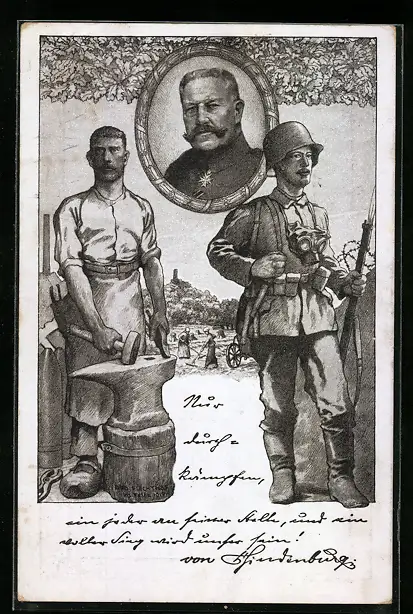 AK Portrait von Generalfeldmarschall Paul von Hindenburg in Uniform m. Pour le Merite, Soldat m. Gasmaske